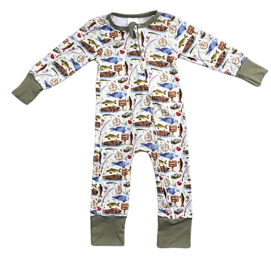 Crafted from soft, breathable bamboo fabric, the Fishing Trip Bamboo Sleeper offers gentle comfort ideal for delicate skin. Featuring a subtle pale gray hue with a charming fishing motif print, it blends style with practicality. Designed with cuffed arms to keep little hands cozy and a convenient two-way zipper for easy diaper changes, this sleeper is both functional and thoughtfully constructed for everyday wear.